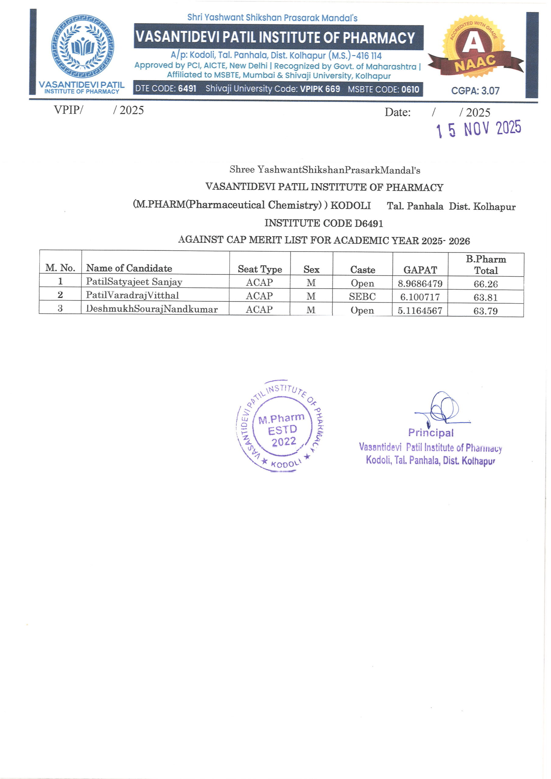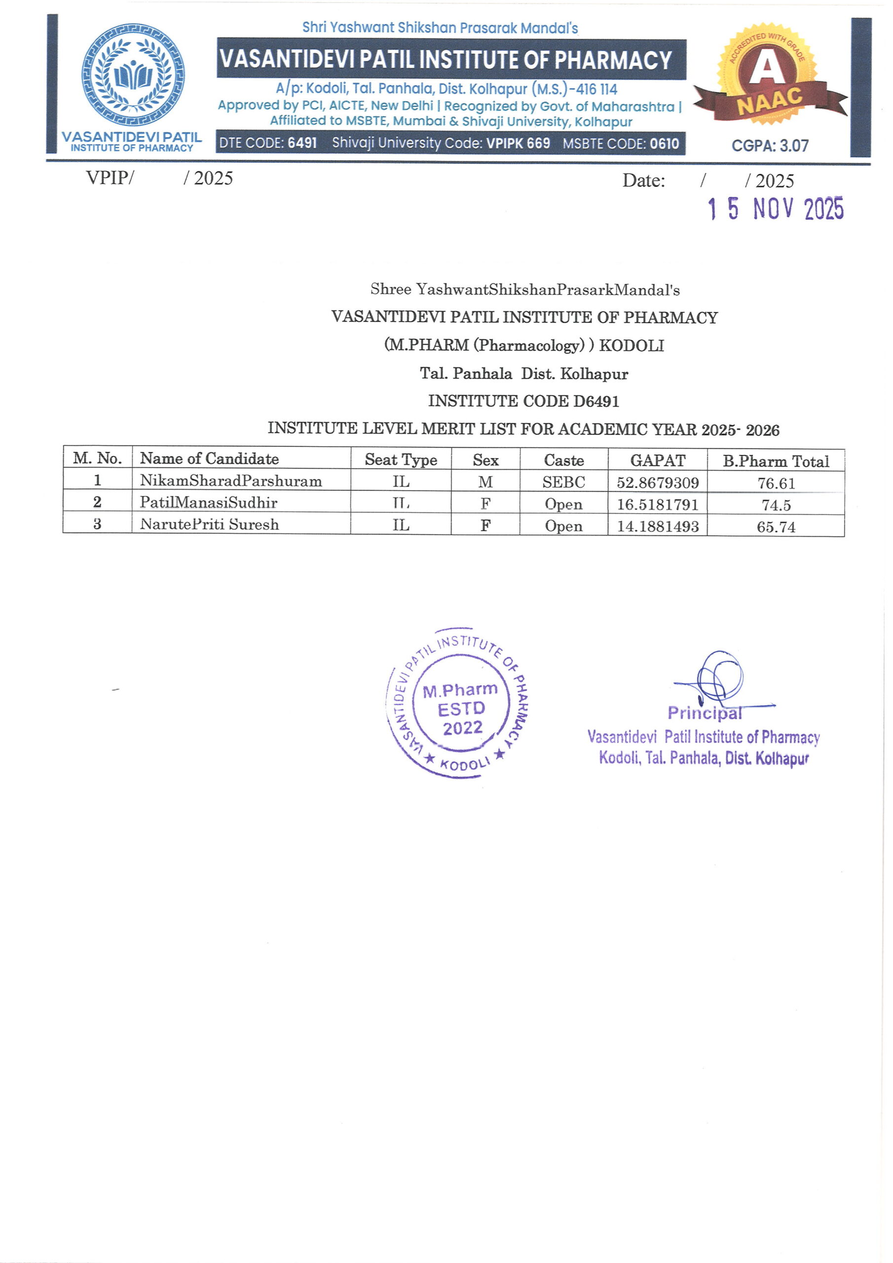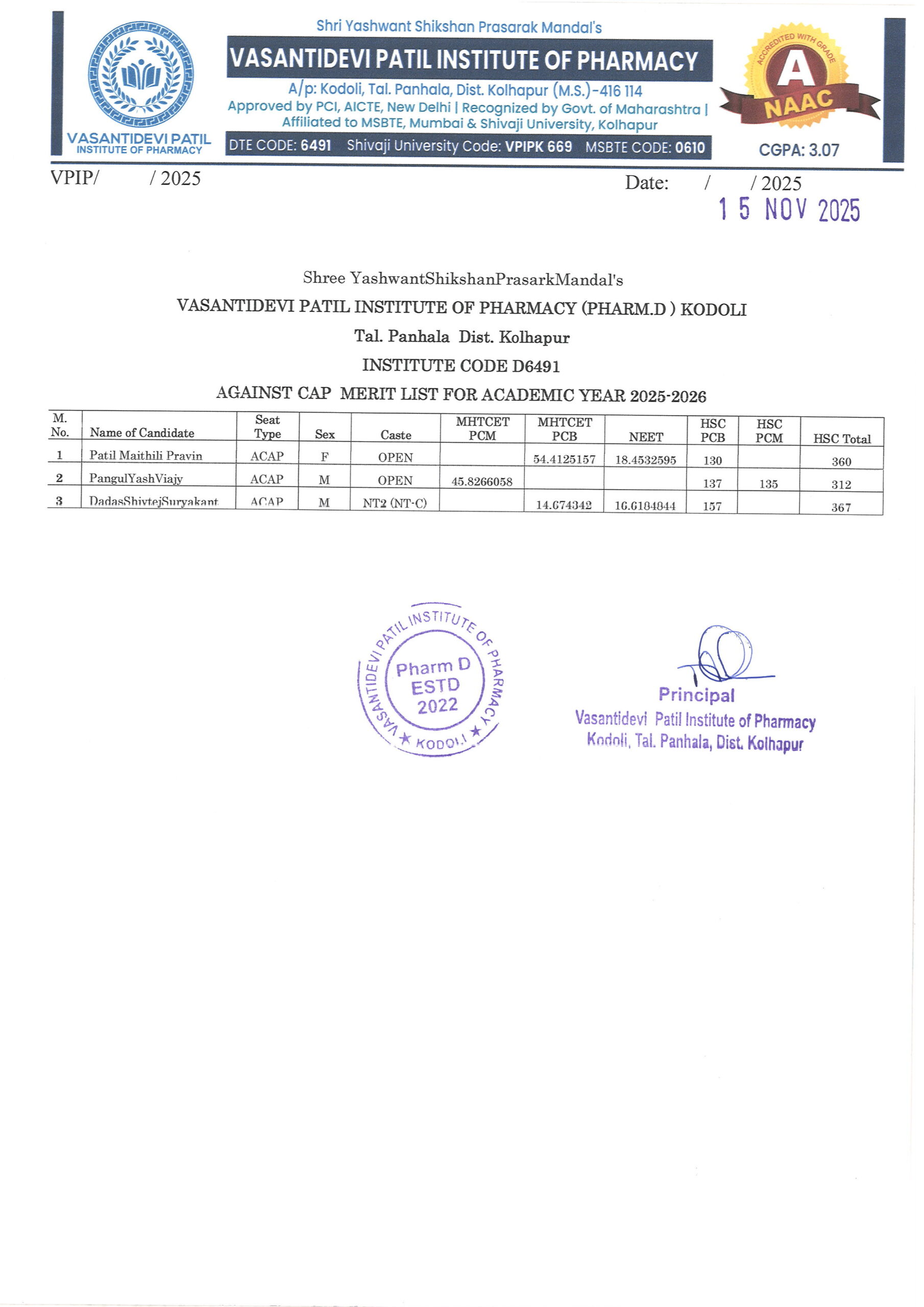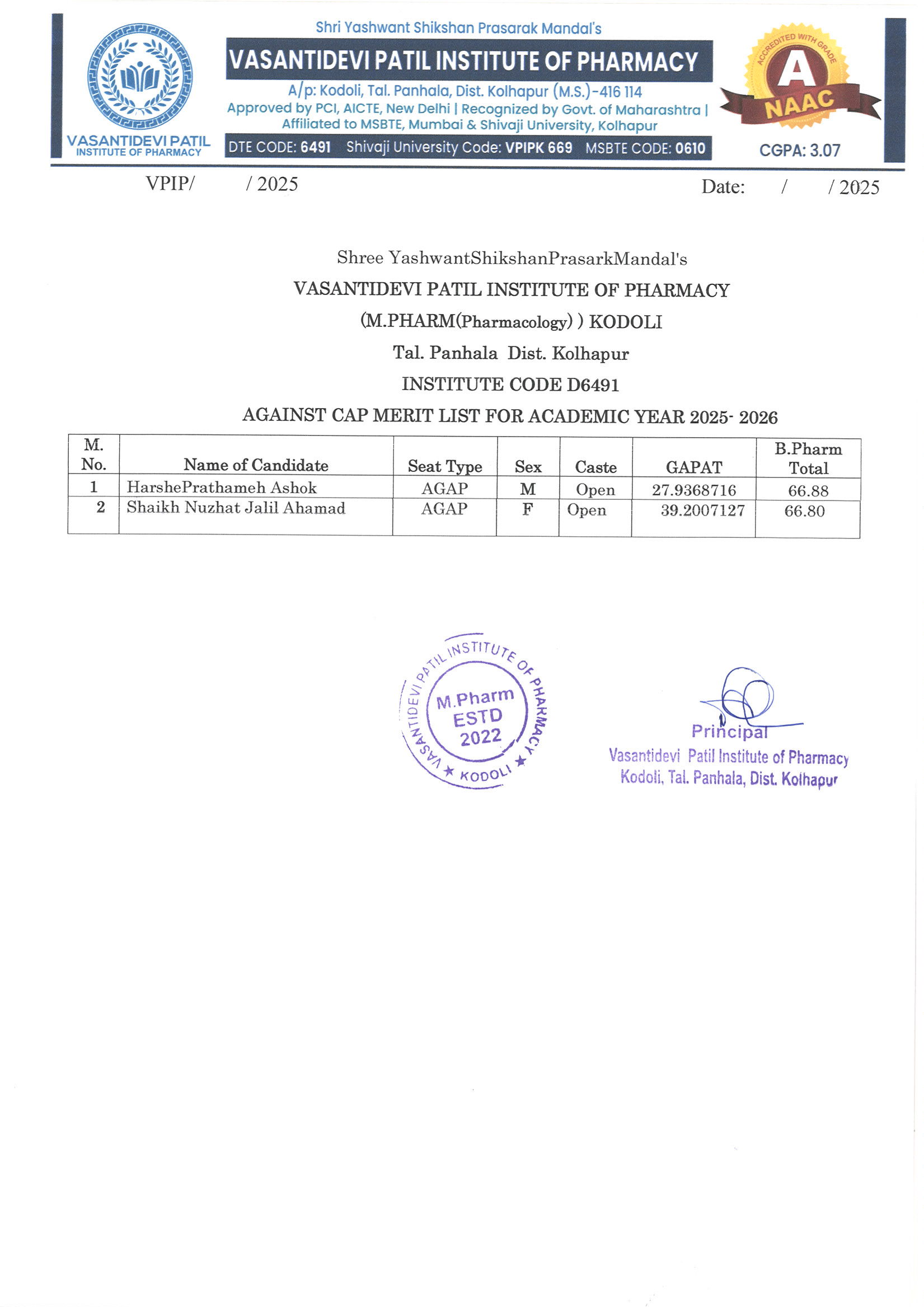 HTML marquee Tag Vasantidevi Patil Institute of Pharmacy, Kodoli, has been accredited with an A Grade, achieving an impressive CGPA of 3.07 by NAAC.