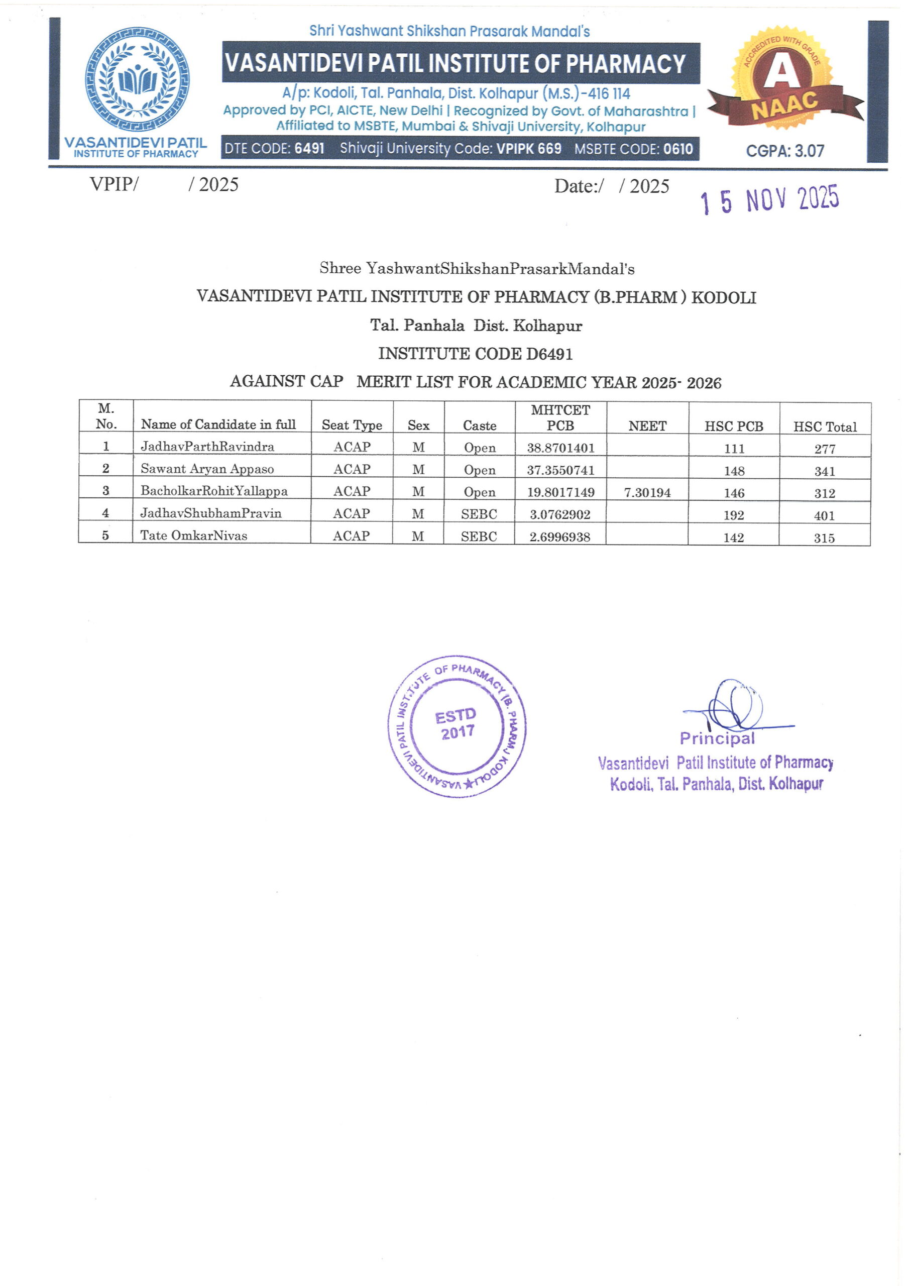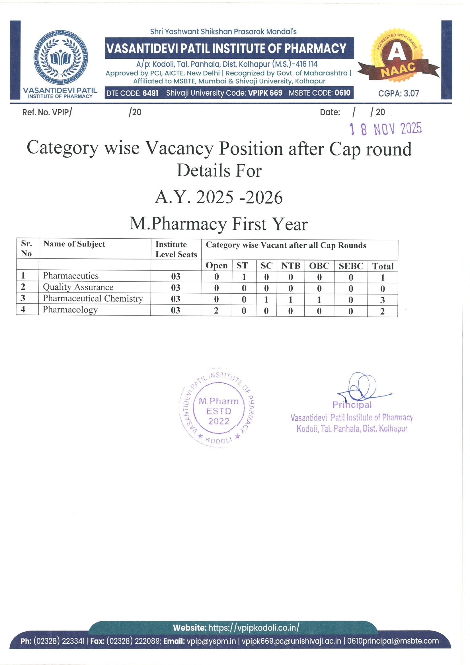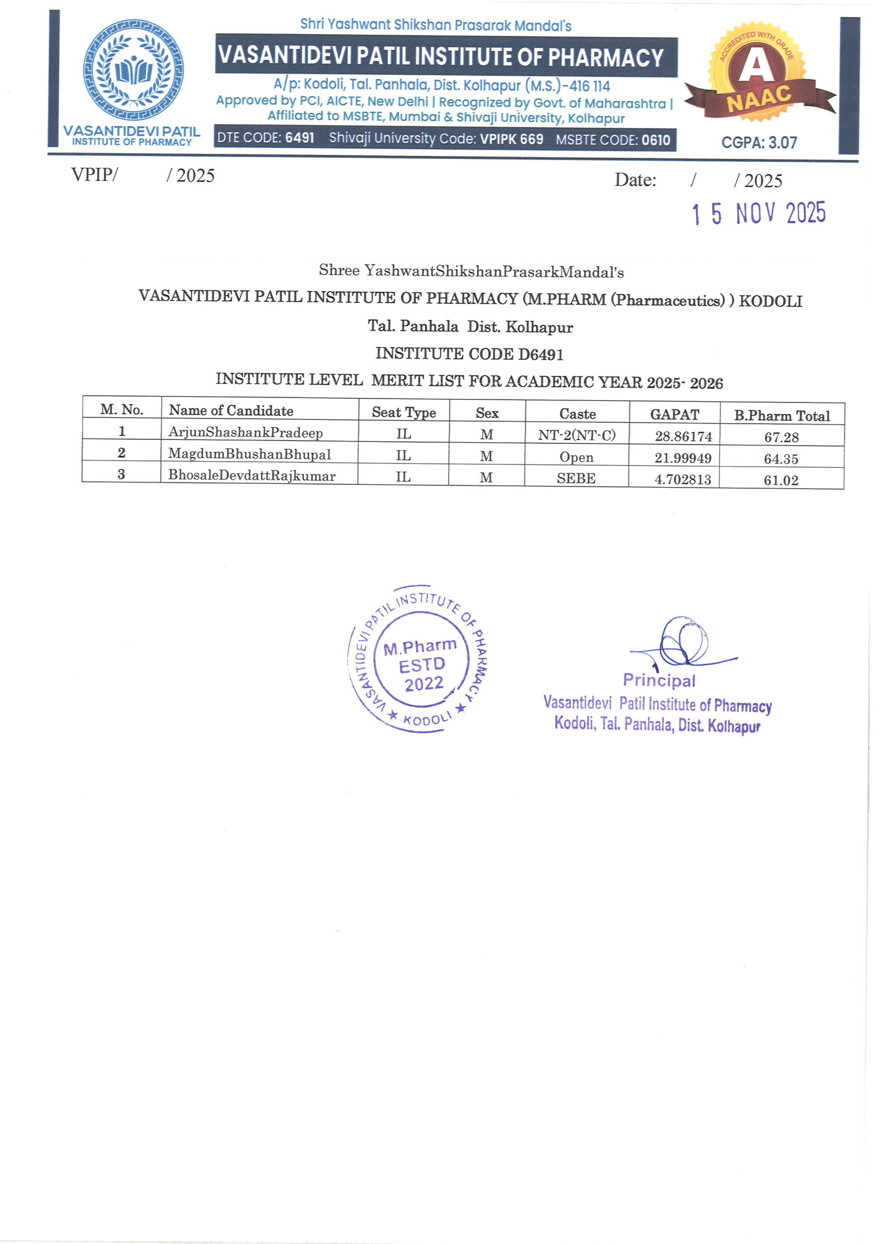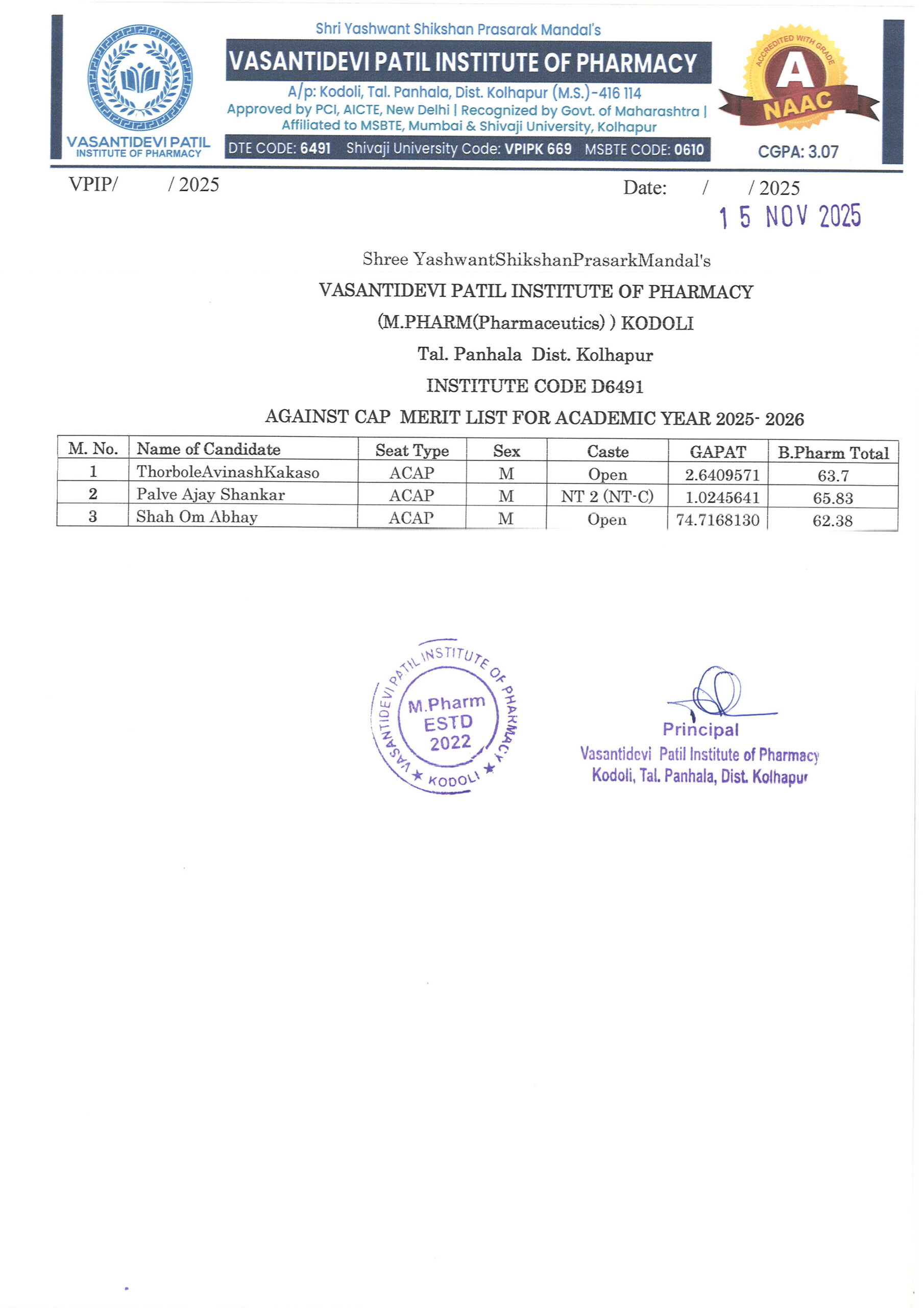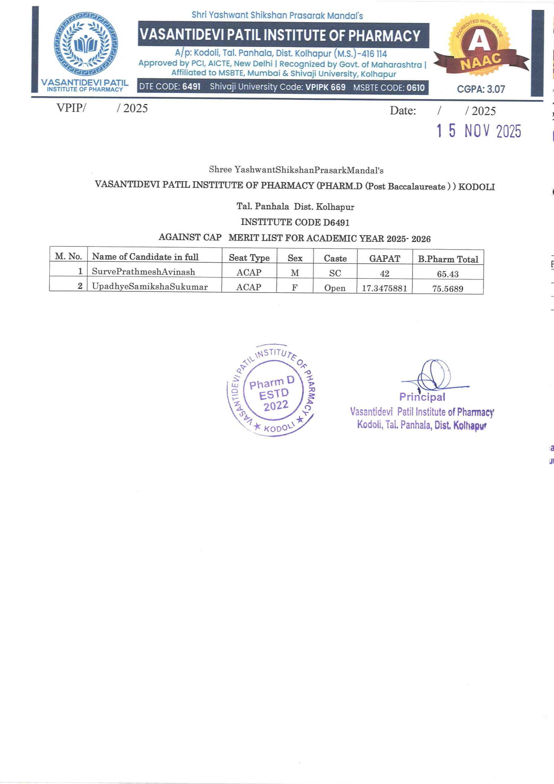 HTML marquee Tag Vasantidevi Patil Institute of Pharmacy, Kodoli, has been accredited with an A Grade, achieving an impressive CGPA of 3.07 by NAAC.