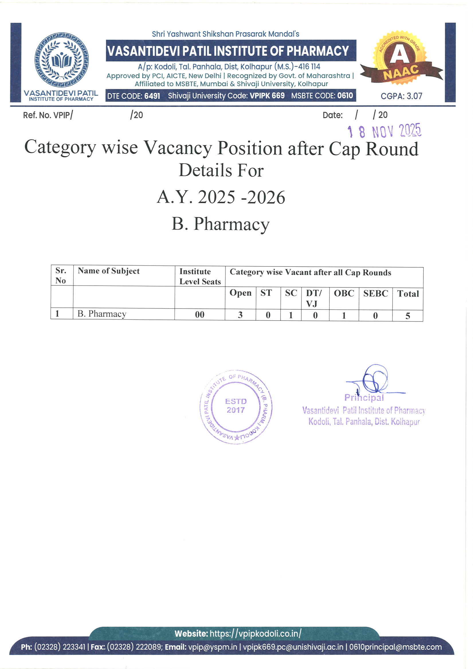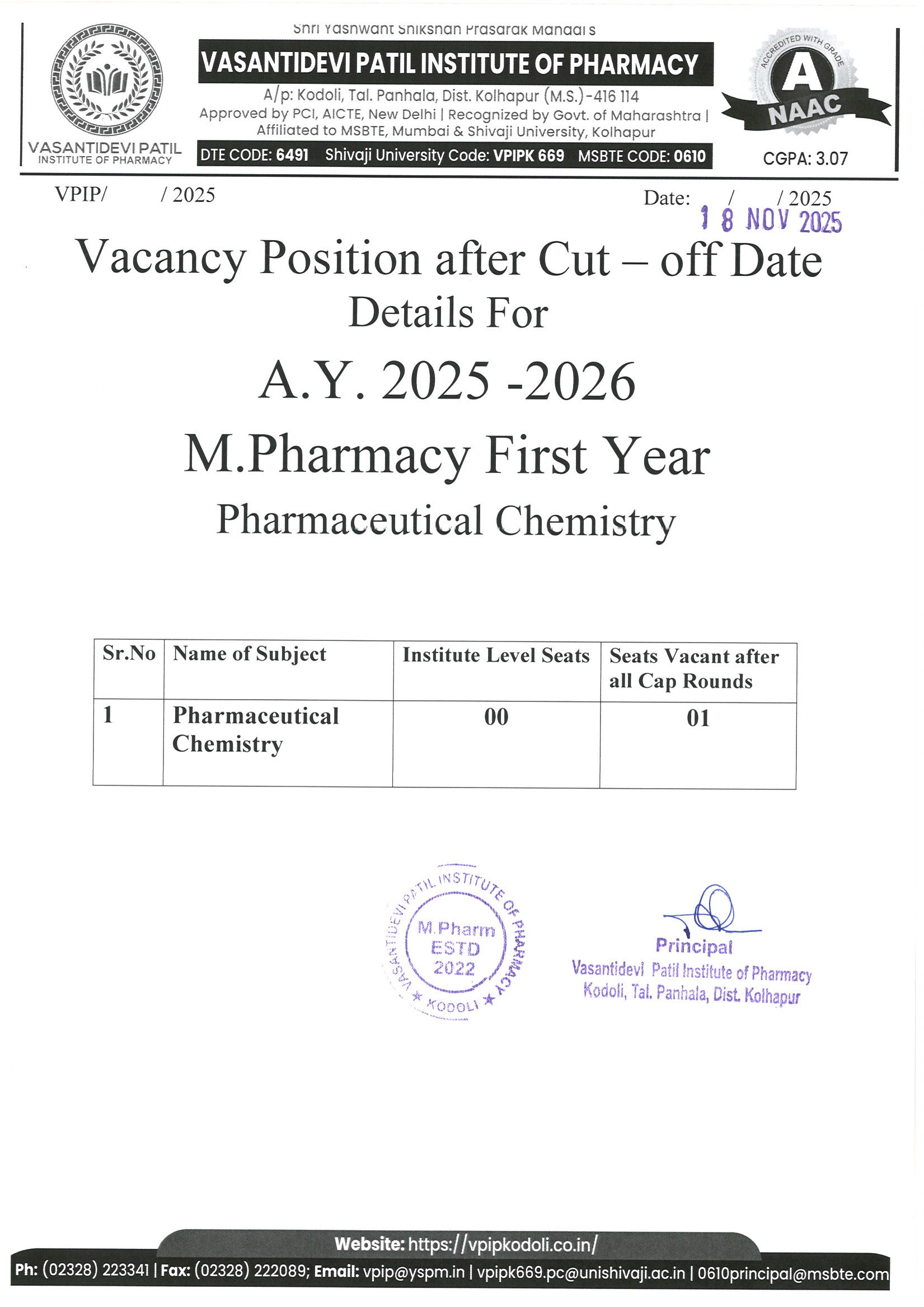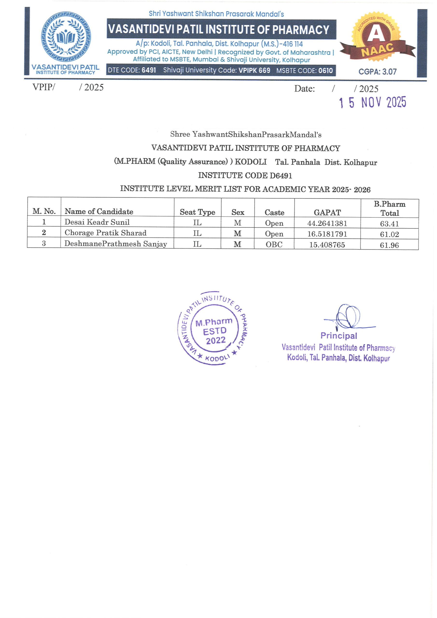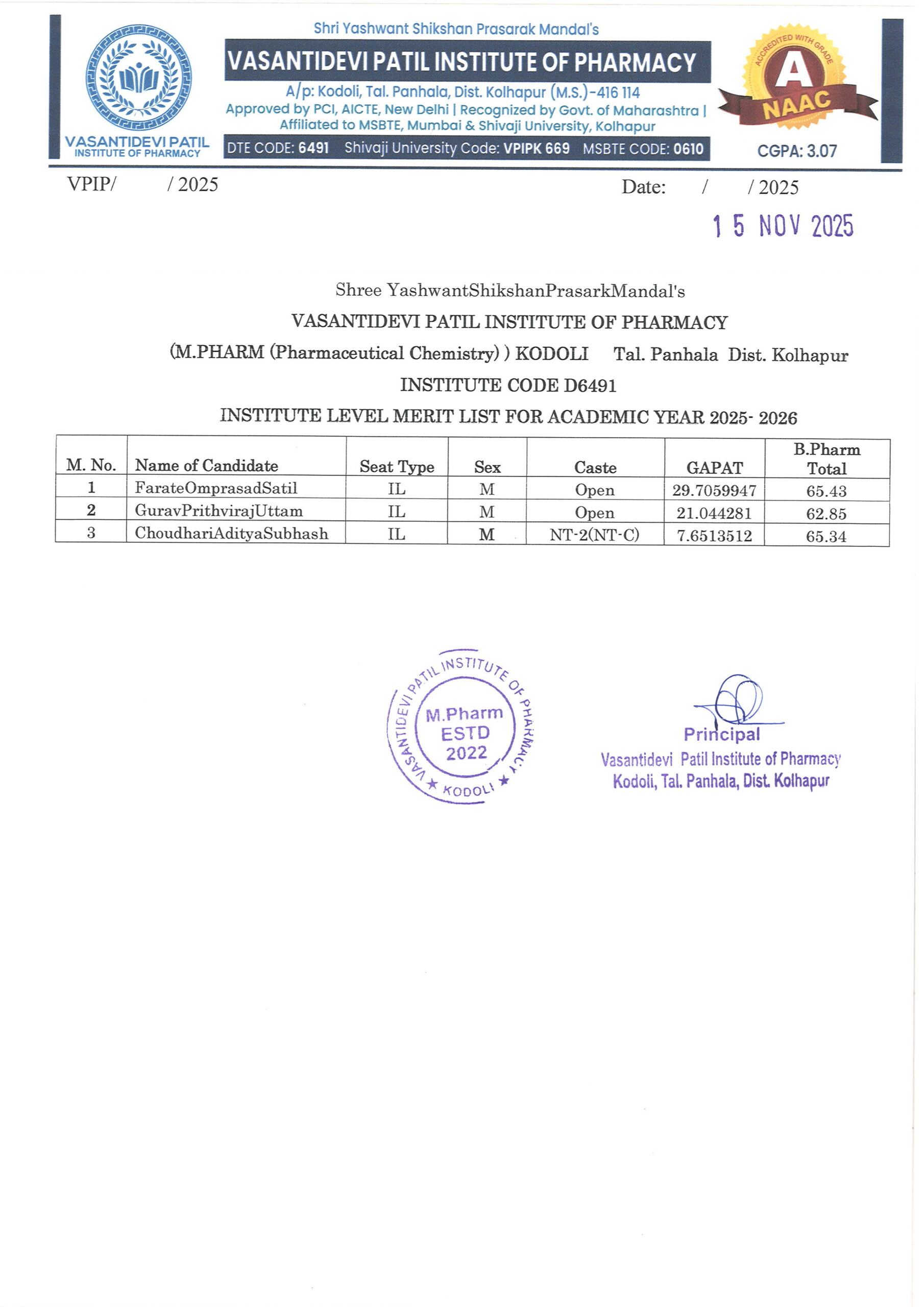 HTML marquee Tag Vasantidevi Patil Institute of Pharmacy, Kodoli, has been accredited with an A Grade, achieving an impressive CGPA of 3.07 by NAAC.