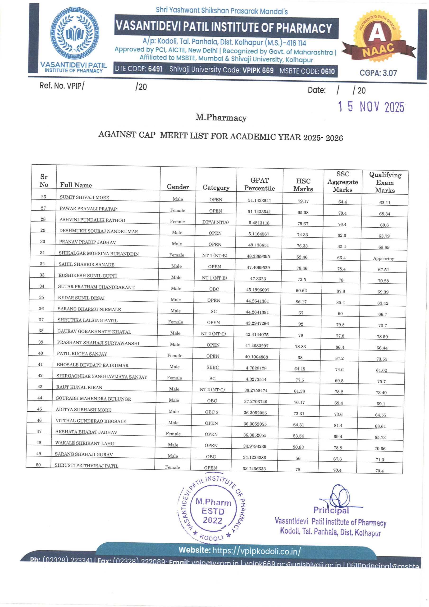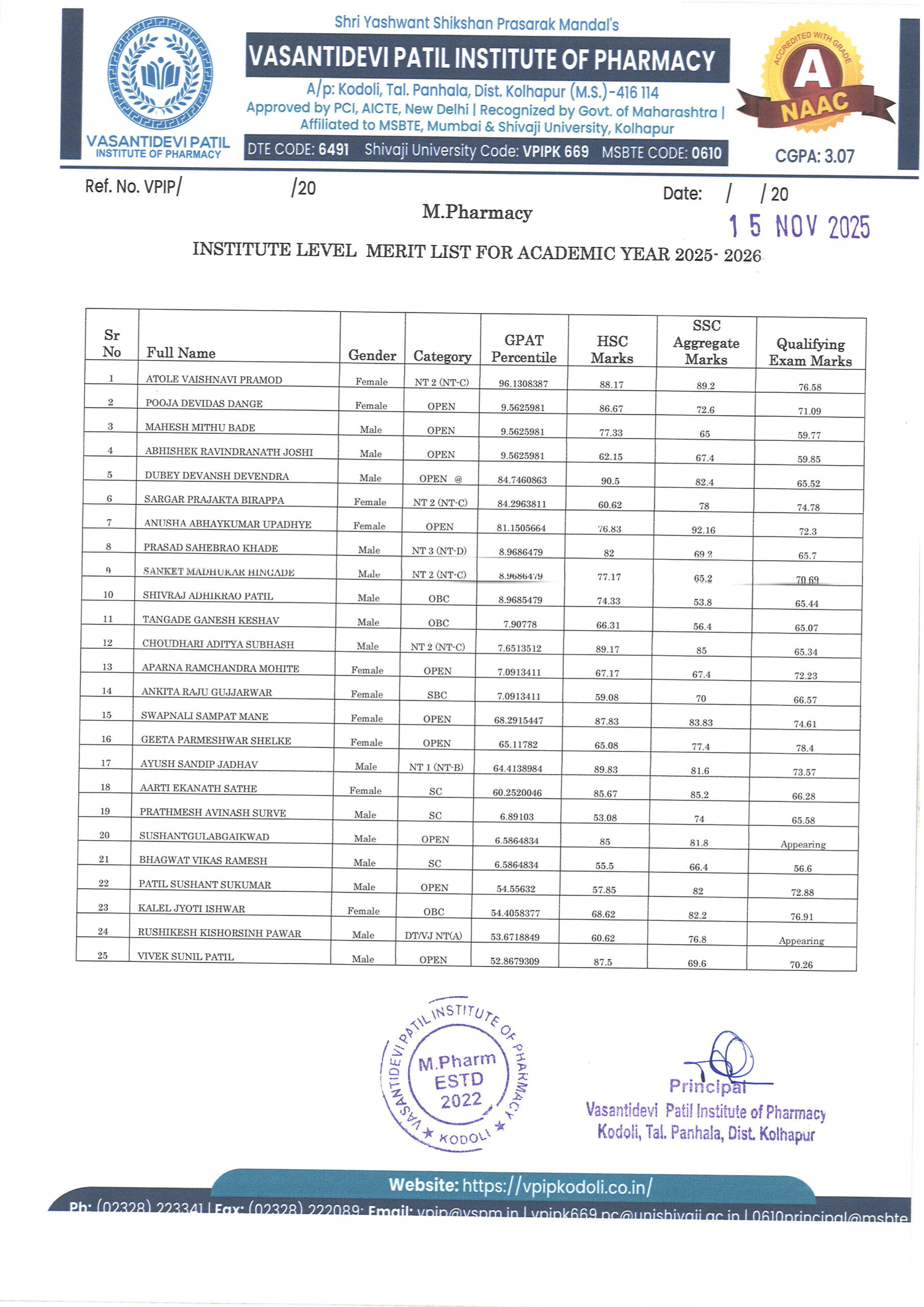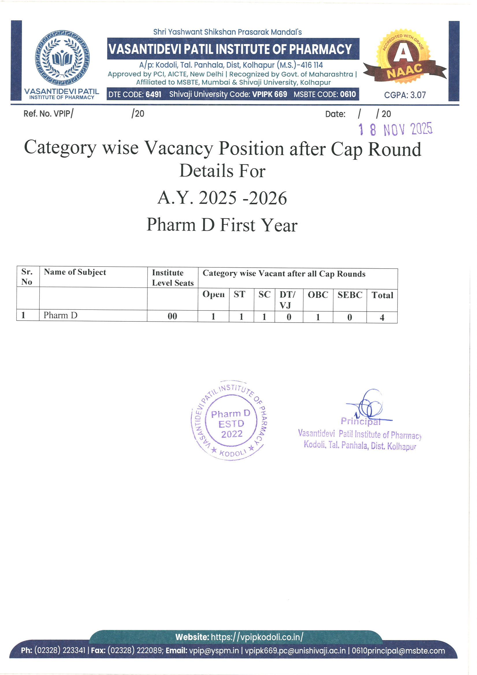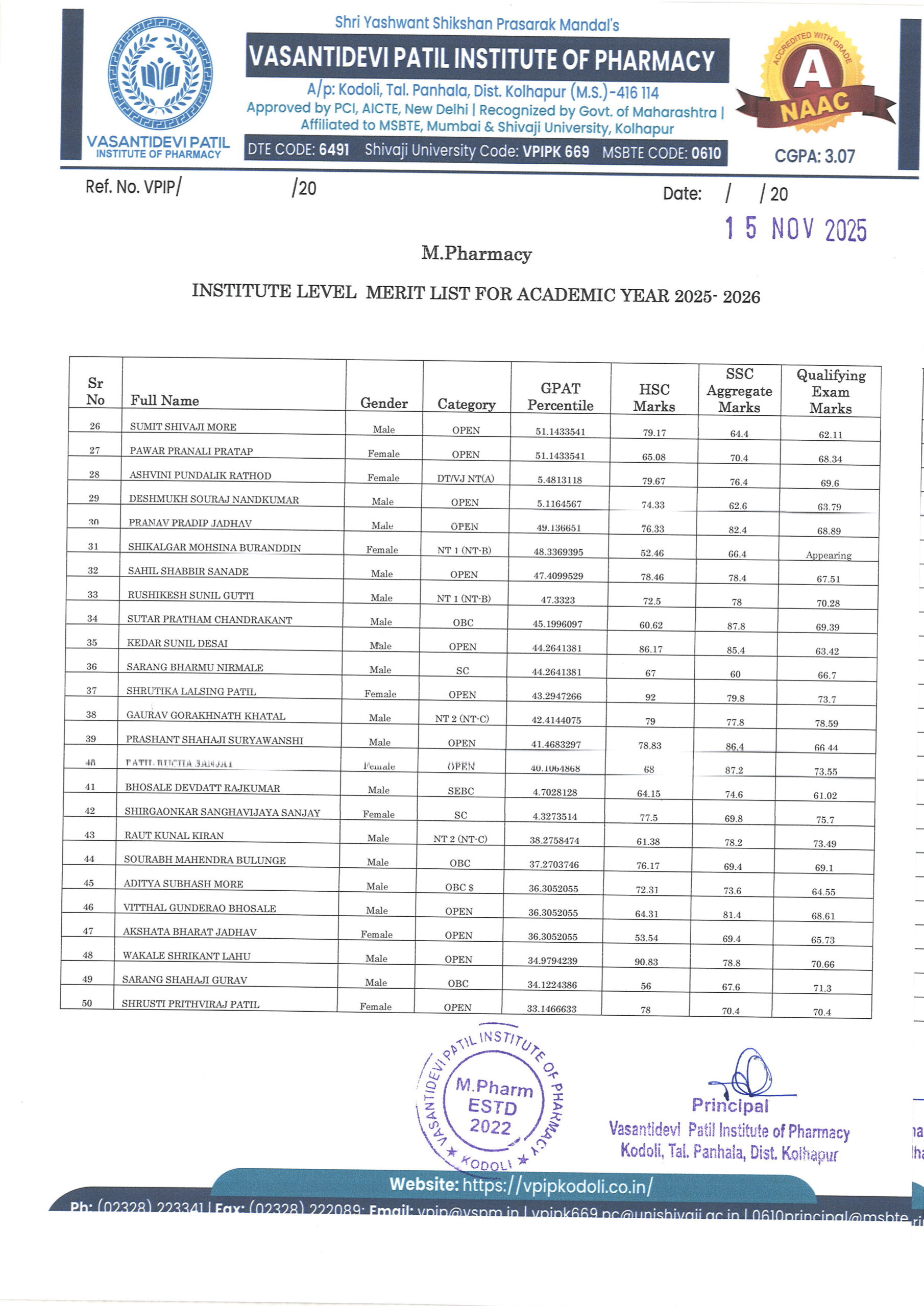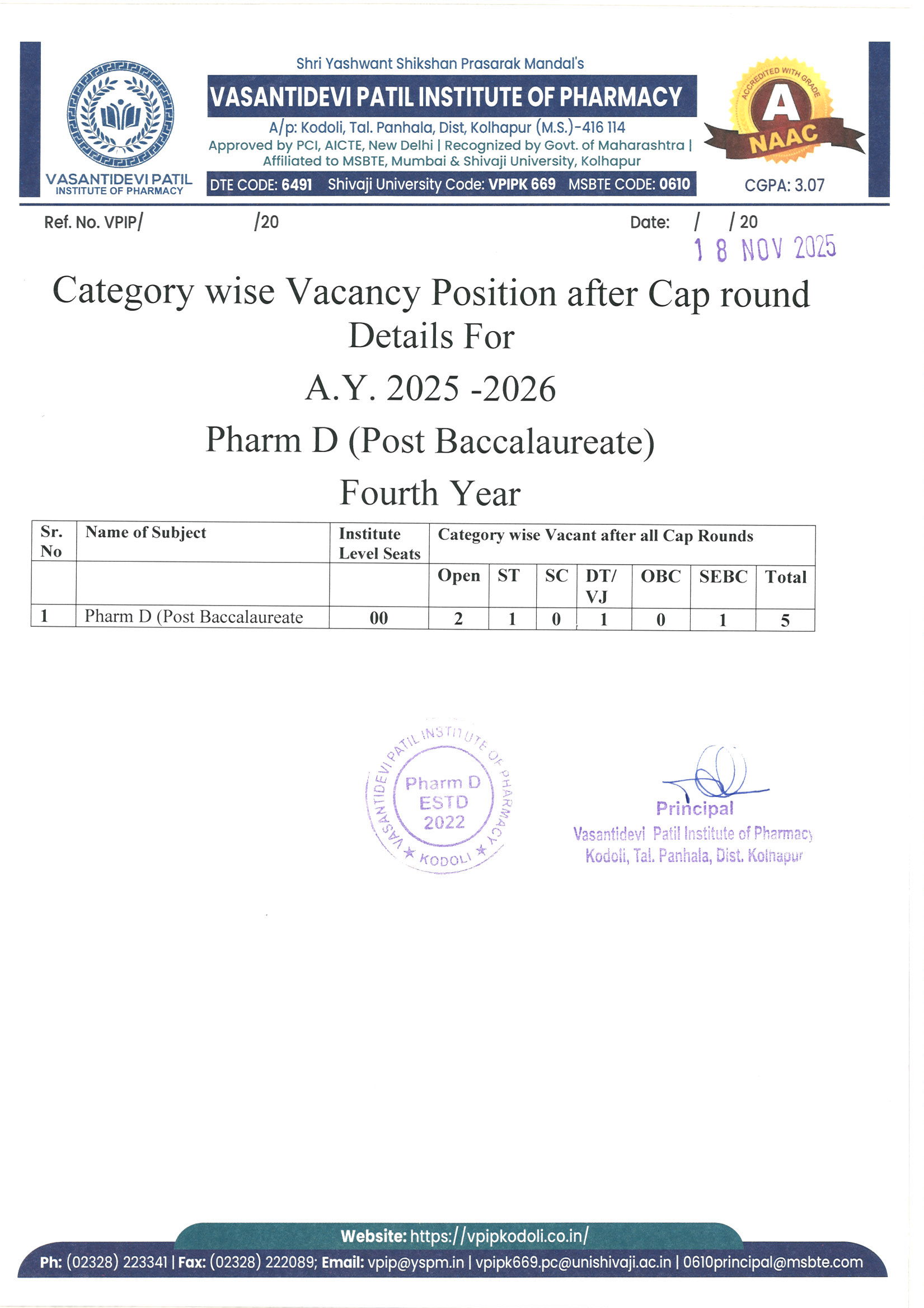 HTML marquee Tag Vasantidevi Patil Institute of Pharmacy, Kodoli, has been accredited with an A Grade, achieving an impressive CGPA of 3.07 by NAAC.
