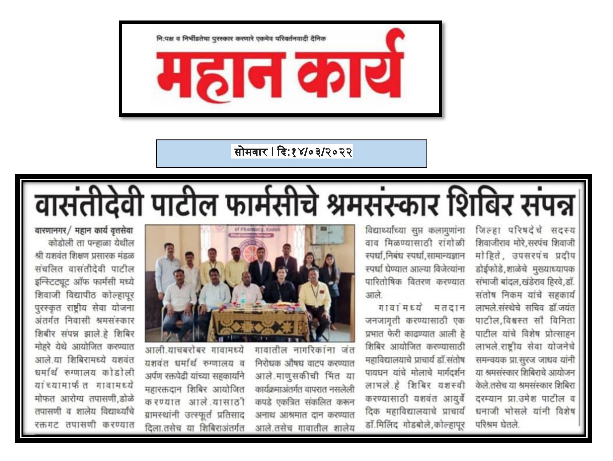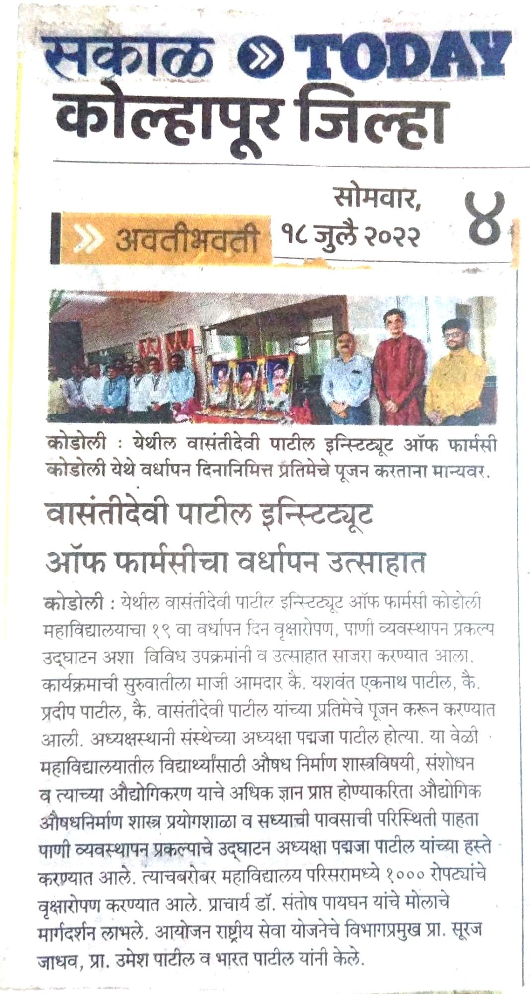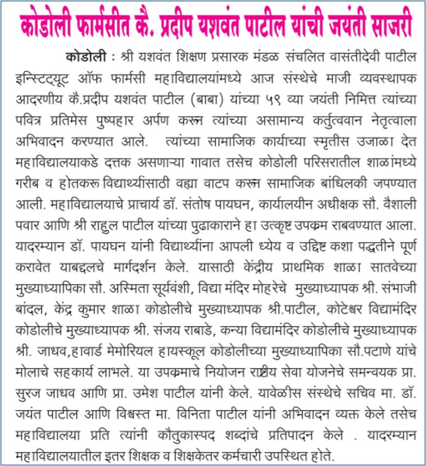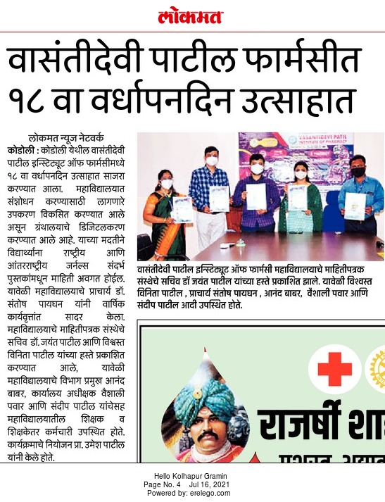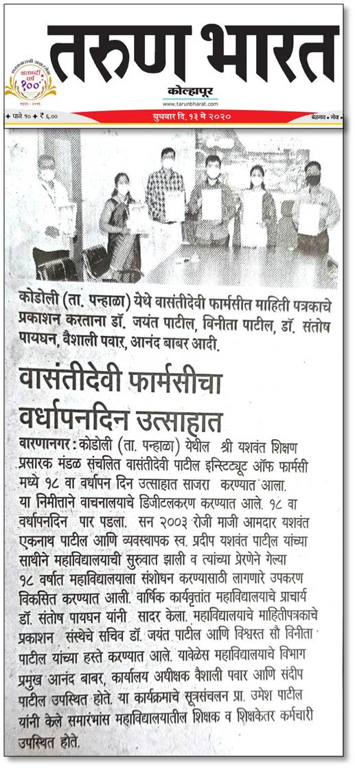 HTML marquee Tag Vasantidevi Patil Institute of Pharmacy, Kodoli was established with the aim to impart quality pharmacy education and training to cater the needs of the pharmacy profession and society at large. The journey started in 2003 by introducing the first Pharmacy institute in the Kodoli under aegis of Shri Yashwant Shikshan Prasarak Mandal, Kodoli. The institute is approved by AICTE New Delhi, PCI New Delhi, and DTE Mumbai, recognized by Government of Maharashtra & affiliated to a MSBTE, Mumbai and Shivaji University, Kolhapur. The Institute is situated at the foot hills of Panhala, in the area of Kodoli, about 10 kilometres away from National Highway- 4 and 35 km away from major city, Kolhapur. The institute occupies the area of approximately 4 acres having its own 5470 sq.mts. building with excellent infrastructure which in-houses facilities such as sophisticated laboratories, resourceful library with latest books, national& international journals and well-equipped classrooms with modern teaching aid. Vasantidevi Patil Institute of Pharmacy is a progressive edifying organization, dedicated to the pursuit of excellence. This institute has been dedicated to decree solutions to big challenges and to prepare the student for leadership in a multifaceted world.